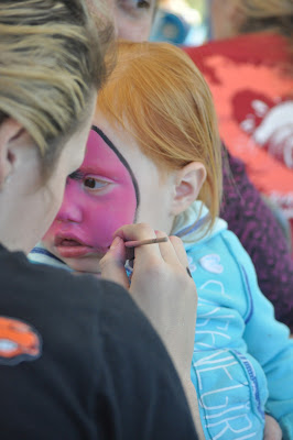 We also recently went to a fall festival that is put on annually by a local church. Addison and I went to this festival last year and had a great time. This year, Adam and Broughton joined in the fun! Surprisingly, shortly after we got there, Addison said she wanted to get her face painted. We had seen several painted faces and actually watched a few of the people as they were painting, but it did not even cross my mind to ask her if she wanted her face painted because I wouldn't have guessed in a million years that she would. But she sat there as still as a statue, never smiling until after she was all done. She said she wanted a "kitty cat"...